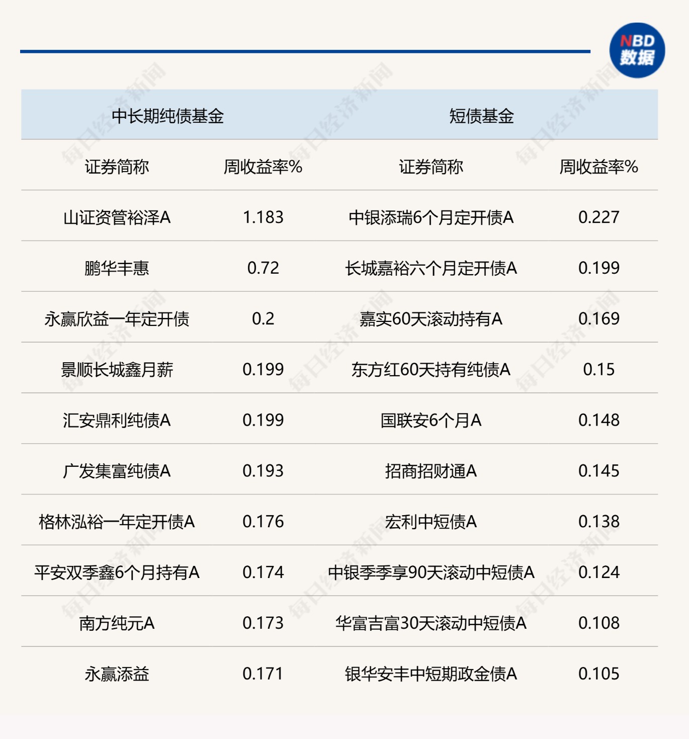 从基金的表现来看,中长期纯债基金的业绩均值大幅回落,相较以往大幅领先短债,上周的领先幅度开始收窄。Wind统计显示,中长期纯债基金的头部业绩产品虽然创下1.18%的单周好成绩,但整体均值为0.07%,短债基金的业绩均值为0.05%。